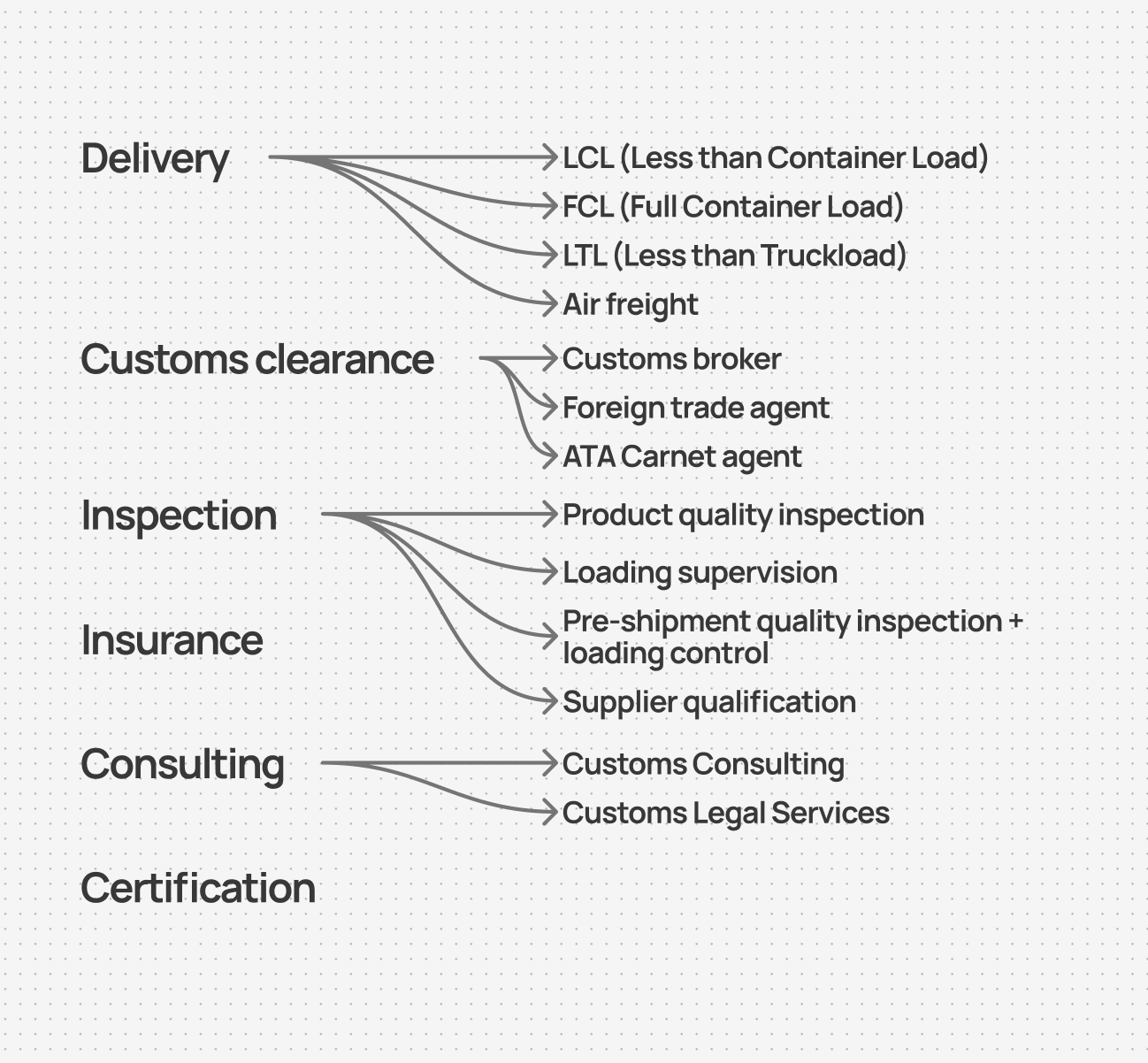 To understand the overall product structure, we worked with the client to create an offering map of all services provided by the company. The result was a multi-level service tree covering logistics, customs, inspection, and related services.