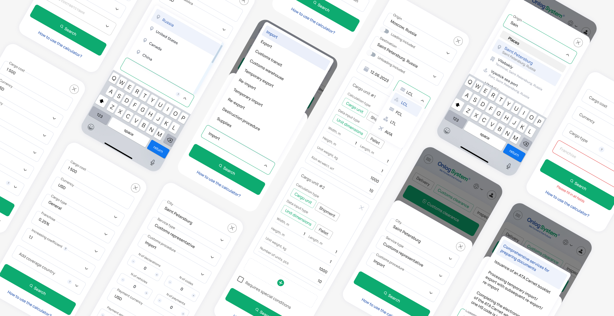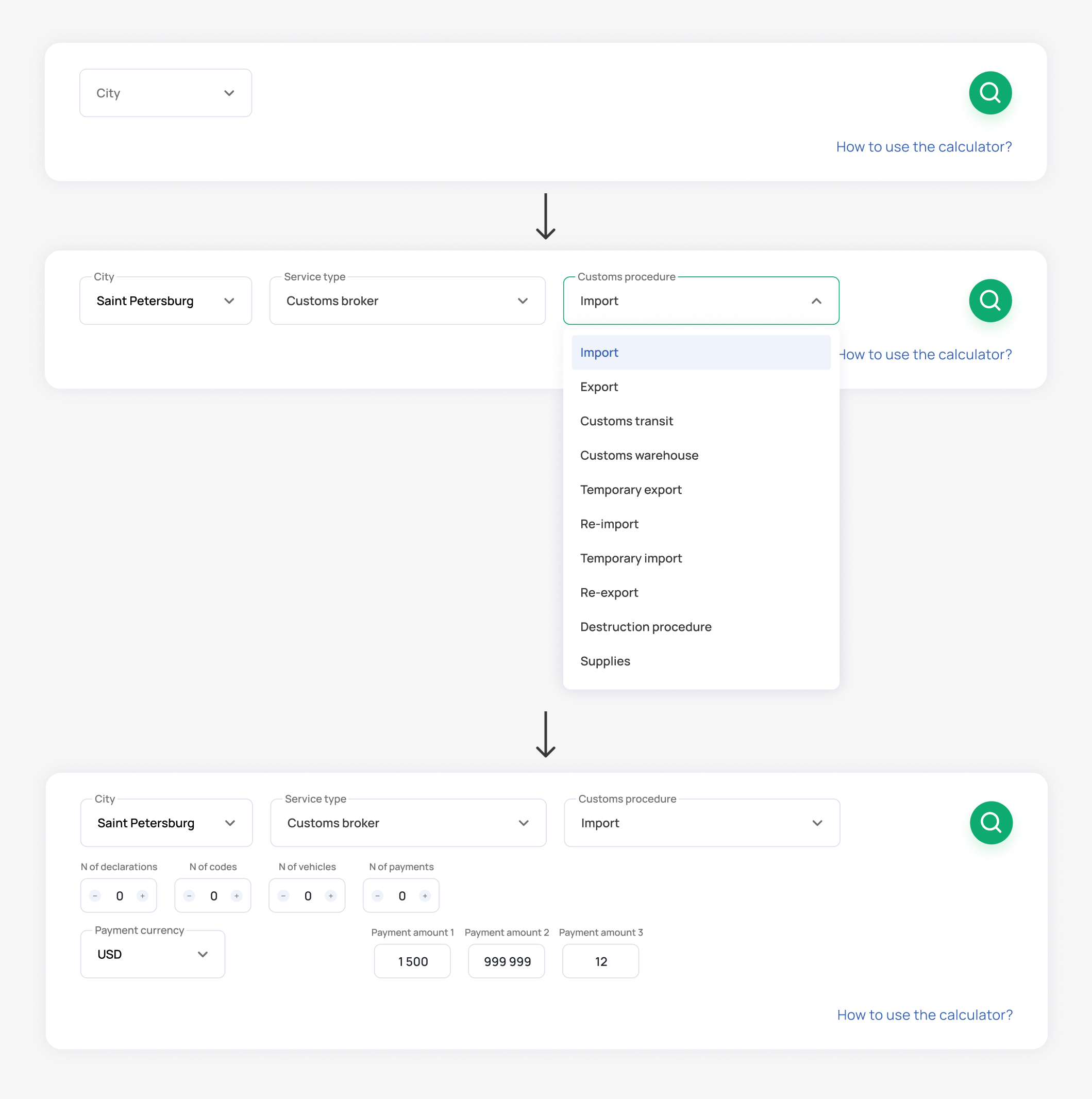On example of Customs clearance flow: User selects a city → If the service is available in that location, the fields Service type and Customs procedure appear → Depending on the selected values, additional input fields are revealed dynamically.